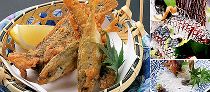 釣り上げたお魚を調理して、夕食のメニューへの追加を承ります。お魚によって、大きさによって、お好みによって、「唐揚げ」「煮つけ」「焼き物」「お造り」にいたします。