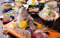鯛本来の上品で淡白な味わいをいかす活造りや、那智黒石を敷き詰めた宝楽鍋で蒸し焼きにした宝楽焼きなどが有名です。