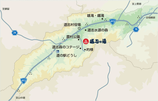 中央自動車道 都留IC. → 道志村 30分/20km 中央自動車道 相模湖IC. → 道志村 50分(藤野経由)/30km 東名高速道路 御殿場IC. → 道志村 50分(山中湖経由)/35km 中央自動車道 河口湖IC. → 道志村 50分(山中湖経由)/38km JR横浜線 橋本駅 → 道志村 1時間(三ヶ木、月夜野経由)/40km