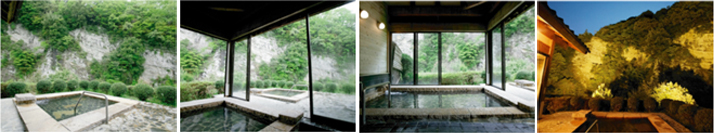 ホテル・シルクヴィラからプールサイドを通りぬけると、ロマンの森の露天風呂【白壁の湯】があります。小糸川渓谷の対岸に見える、自然のつくり出した断崖は100mにわたり、他に類を見ない絶景を生み出しています。夜間はライトアップされ、昼間とはひと味違った感動を与えてくれます。ゆっくりくつろいでいただける休憩室では、お食事もお召し上がりいただけます。ロマンの森にお越しの際は、大自然に包まれた露天風呂と絶景をご堪能ください。