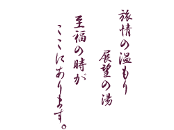 ● 温泉泉質 アルカリ性単純泉(源泉掛け流し) ● 温泉効能 神経痛・リウマチ・打ち身・慢性消化器病・火傷・冷え性・疲労回復など。